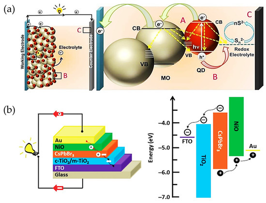 (a) Schematic representation of the working principle of a quantum dot-sensitized solar cell (QDSSC). A, B and C describe the possible ways of carrier transport: A—QDs-semiconductor, B—redox electrolyte—QDs, C—counter electrode to redox electrolyte. Yellow arrows indicate the possible carrier recombination pathways in each component of the QDSSC; reproduced with permission [34]. Copyright 2018. American Chemical Society. (b) Schematic of a conventional architecture of a perovskite solar cell (PSC) and the corresponding relative energy positions of the components of the solar device; reproduced with permission [36]. Copyright 2019. John Wiley & Sons, Inc.