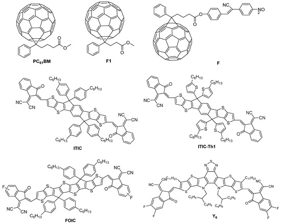Chemical structure of fullerene derivatives such as PC61BM [86], F1 [87], and F [88] and NFA derivatives such as ITIC [89], ITIC-Th1 [90], FOIC [91], and Y6 [92] employed in OSCs.