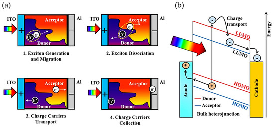 (a) Steps involved in energy production upon illumination (From exciton generation until charge carrier collection). (b) Band diagram of the photocurrent generation mechanism in a BHJ solar cell. Reproduced with permission [115]. Copyright 2018. Elsevier.