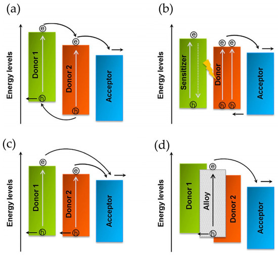 Schematic, working principles in ternary OSCs. (a) Mechanism of charge transportation (additional donor functions for charge transport). (b) Mechanism of energy transfer (from photo-excited sensitizer to host donor). (c) The parallel like mechanism (formation of independent hole transport network from the additional donor). (d) The alloy model (coupling of new charge-transfer state by host donor). The arrows show the proposed path for charge carrier and charge transportation. Reproduced with permission [122]. Copyright 2018. John Wiley and Sons, Inc.