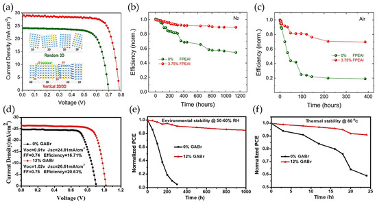 - Cho, Y.; Soufiani, A.M.; Yun, J.S.; Kim, J.; Lee, D.S.; Seidel, J.; Deng, X.; Green, M.A.; Huang, S.; Ho-Baillie, A.W.Y. Mixed 3D–2D Passivation Treatment for Mixed-Cation Lead Mixed-Halide Perovskite Solar Cells for Higher Efficiency and Better Stability. Adv. Energy Mater. 2018, 8, 1703392. [Google Scholar] [CrossRef]