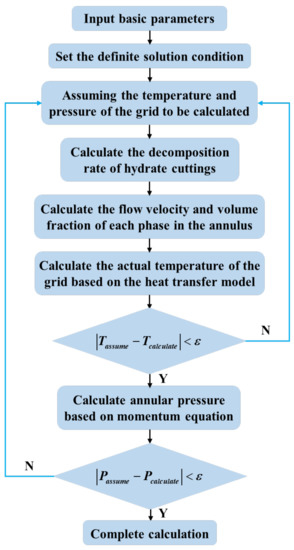 Due to the complexity of the gas–liquid–solid three-phase flow in the annulus, it is very difficult to directly solve the model. Therefore, this study adopts numerical methods to solve the model. The solution process is shown in Figure 1. The numerical solution method used in this study is a differential iterative solution. After setting the calculation parameters and solution conditions, the temperature and pressure of the grid are assumed first. Then, the decomposition rate of the hydrate cuttings is calculated as well as the flow rate and volume fraction of each phase. The grid temperature is calculated based on the heat transfer equation, and the grid pressure is calculated based on the momentum equation. If the calculated values of temperature and pressure exceed the allowable error from the assumed values, the calculated values of temperature and pressure are used instead of the assumed values to recalculate until the calculated values of temperature and pressure are less than the allowable error compared to the assumed values.