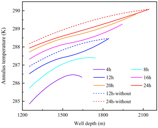 Figure 2 shows the variation of the annulus temperature distribution with circulation drilling time. With the increase in circulating drilling time, the annulus temperature shows a trend of increasing gradually, but the increasing range gradually decreases. After circulation for 20 h or more, the annulus temperature increases slightly and reaches a relatively stable state. The annulus temperature is lower than the hydrate phase equilibrium temperature when drilling for 4 h and 8 h, and the hydrate cuttings are not decomposed. Due to heat exchange between the annulus drilling fluid and the drill pipe and reservoir around the well, the annulus temperature increases slightly at first and then decreases gradually. The annulus temperature is higher than the hydrate phase equilibrium temperature after circulating drilling for 12 h or more. Due to the influence of migration and the decomposition of hydrate cuttings and heat transfer with the formation around the well, the annulus temperature gradually decreases from the bottom hole to the mud line. When circulating drilling at 12 h and 24 h, the reduction range of the annulus temperature from the bottom to the mud line gradually increases when the influence of hydrate cuttings decomposition is not considered, while the reduction range of the annulus temperature decreases first and then increases when the influence of hydrate cuttings decomposition is considered. The decreasing section is mainly dominated by the decomposition of hydrate cuttings because with the gradual reduction in the undecomposed hydrate in cuttings, the influence of the heat absorption of hydrate cuttings on the annulus temperature drop is gradually weakened. The decreasing range of annular temperature increases mainly due to the influence of ambient temperature, and the decreasing range of annular temperature increases due to the significant decrease in the ambient temperature near the mud line. The temperature drop in the returned drilling fluid caused by the decomposition of hydrate cuttings at 12 h and 24 h of circulating drilling is 0.39 °C and 0.22 °C, respectively. This is mainly caused by drilling different layers. It is located at the bottom of the hydrate layer when circulating for 12 h, and the hydrate saturation in the hydrate cuttings is relatively high, while it is located at the bottom of the three-phase layer when circulating for 24 h, and the hydrate saturation in the hydrate cuttings is relatively low. Therefore, when drilling a high hydrate saturation reservoir, considering the influence of the hydrate phase transition on the annulus is more conducive to the accurate prediction of the annulus temperature.