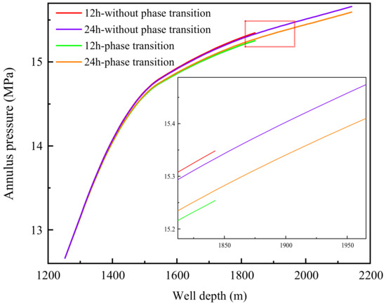 Figure 3 shows the comparison of the annulus pressure when drilling the hydrate layer and three-phase layer. Due to the influence of hydrate cuttings decomposition, the bottom hole pressure difference is 0.093 MPa when circulating drilling for 12 h and 0.061 MPa when circulating drilling for 24 h. This mainly depends on the hydrate saturation in the cuttings which is located at the bottom of the hydrate layer when circulating for 12 h. Since hydrate saturation in this layer is relatively high, the decomposition of the hydrate cuttings has a large impact on the bottom hole pressure. The above calculation shows that the decomposition of hydrate cuttings has little effect on the annulus pressure when riserless drilling in the hydrate layer. Due to the relatively high annular pressure below the mud line and the relatively small gas volume, the decomposition of hydrate cuttings has little impact on the annular pressure. However, due to the heterogeneity of the actual hydrate reservoir, the influence of hydrate phase transition on annulus pressure will increase when drilling into a continuous high saturation area. Therefore, in order to improve the prediction accuracy of annulus pressure, the influence of hydrate cuttings decomposition should be considered when drilling a hydrate layer with high hydrate saturation.