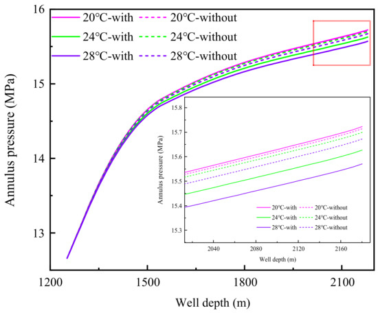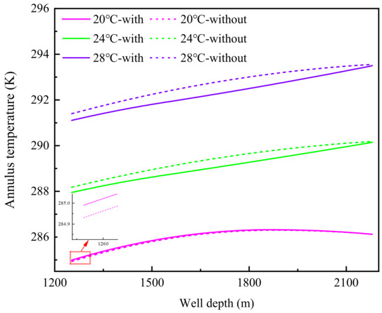 - When the inlet temperature of the drilling fluid is 20 °C, the annulus phase transition is mainly hydrate generation by free gas. However, the generation rate is very low, and the influence on the annulus temperature and pressure can be ignored. When the inlet temperature of the drilling fluid is 24 °C and 28 °C, the annulus phase transition is mainly the decomposition of hydrate cuttings. The influence of hydrate cuttings decomposition on the annulus temperature and pressure increases significantly with the increase in inlet temperature.