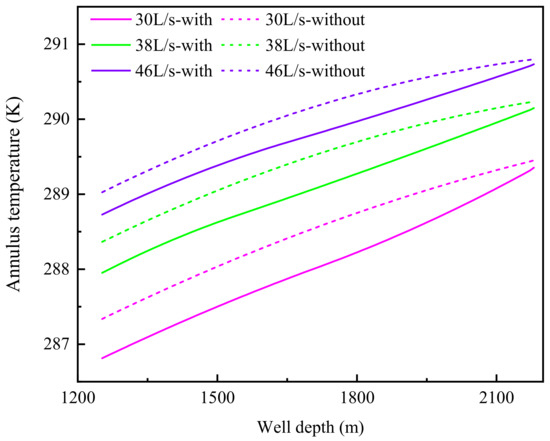 Figure 7 and Figure 8 show the annulus temperature and pressure curves of riserless horizontal well drilling in the hydrate reservoir under different drilling fluid displacement. With the increase in drilling fluid displacement, the heat transfer time between the fluid in the drill pipe and seawater decreases, and the bottom hole temperature increases, while the annular pressure loss increases significantly with the increase in displacement, and the bottom hole pressure increases accordingly. When the displacement of drilling fluid is 30 L/s and 46 L/s, the bottom hole temperature is 289.35 °C and 290.73 °C, respectively, and the bottom hole pressure is 15.542 MPa and 15.749 MPa, respectively, considering the decomposition of hydrate cuttings. When comparing the annulus temperature and pressure curves under different drilling fluid displacement, it is found that the influence of hydrate cuttings decomposition on annulus temperature and pressure decreases gradually with the increase in displacement. When the drilling fluid displacement is 30 L/s and 46 L/s, the return temperature drop of drilling fluid caused by hydrate cuttings decomposition is 0.53 °C and 0.31 °C, respectively, and the bottom hole pressure drop is 0.095 MPa and 0.060 MPa, respectively. This is mainly due to the slow return rate of drilling fluid when the displacement of drilling fluid is low. The volume fraction of hydrate cuttings in the annulus increases, and the decomposition time of hydrate cuttings is prolonged. Therefore, considering the influence of hydrate cuttings decomposition under lower drilling fluid displacement is more conducive to the accurate prediction of the temperature and pressure of riserless drilling in hydrate reservoirs.