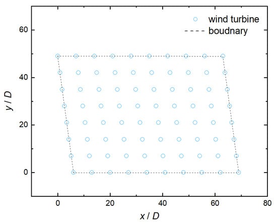 The Horns Rev I offshore wind farm [] has 80 Vestas V80 2 MW wind turbines and a rated capacity of 160 MW. The wind turbine has an 80 m rotor in diameter D and a hub height of 70 m. Figure 1 shows the original layout of the wind farm. The distribution of wind turbines is a rhomboid shape with 8 rows along the x-axis direction and 10 rows along the y-axis direction (a deviation of approximately 7°). Each row has a 7D space in the axis direction.