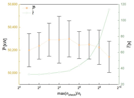 With the increasing value of limitations, as shown in Figure 2, the average of optimized power outputs is increased at first and then reduced, while the computational cost keeps increasing. Due to the property of the RS, the optimization results have a fluctuation even under the identical option. The fluctuation of mean P is low and it is probably from the fluctuation of the RS itself. However, the growth of computational cost is definite. The maximum computational time is triple the minimum one and obtains the minimum optimization results. Therefore, the limitation of ncheck is necessary. Otherwise, the expensive computational cost may be wasted on invalid movements and an inferior optimization result. The limitation of ncheck is set as 4nt in the following optimization.
