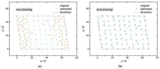 The best optimized layout with the most power output is shown in Figure 4, which is from RS. The optimized layout with the most power output of GS is also shown in Figure 4 for a comparison. As shown in Figure 4a, the wind turbines are split into two parts as far as possible in the wind direction. Compared with the original layout, the optimized one shown in Figure 4a has more space for the wake recovery. In Figure 4b, the optimization by GS is far worse than that of RS. It is still much room for improvement.