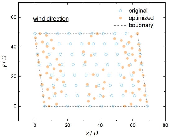 An ideal condition, a steady inflow wind, along the positive direction of the x-axis, is considered in the optimization. This is a commonly used condition in the layout optimization to assess the performance of algorithms [,]. The necessary parameters are summarized in Table 3.