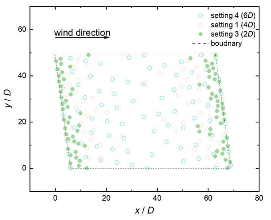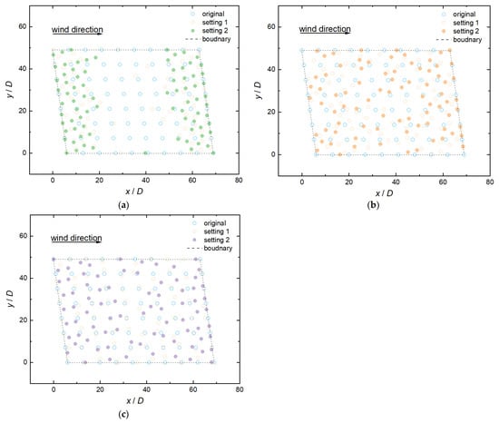 The layouts with the best optimization results of the setting 1, 3, and 4 are shown in Figure 10, which are all obtained by RS. With the reduction in dmin, the wind turbines are gradually concentrated on the upstream and downstream edges of the wind farm. The space for wake recovery becomes larger and larger. It is the reason why the optimized power output is increasing as the decrease in dmin.