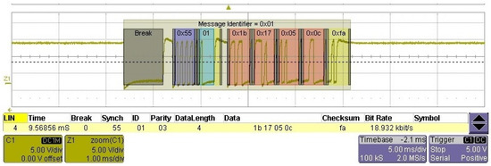 The LIN bus has been tested in the network with the CAN bus gateway in an error condition and transmitting CAN data frames (this will be translated and framed in the form of LIN messages based on CAN data), as illustrated in Figure 17.