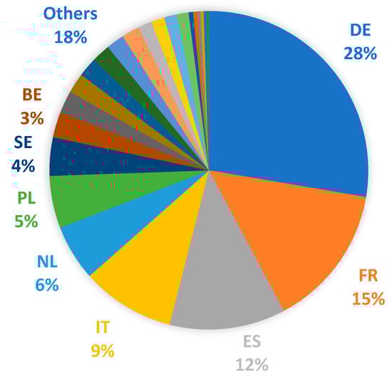The EU framework analysed in this paper is constituted by 27 countries. As mentioned before, the ones more relevant from the point of view of generation capacity were chosen to carry out the proposed analyses. Considering the interconnectivity between them in the union framework, these allow to generate a general overview of the situation in the EU. To choose the specific countries, a threshold of 5% was selected: those countries which own more than 5% of the total generation capacity in the EU were analysed. Figure 1 illustrates this share of capacities, which was obtained through TP data. The ones with more than 5% are Germany (DE), France (FR), Spain (ES), Italy (IT), The Netherlands (NL), and Poland (PL).