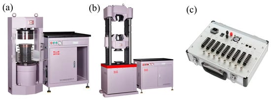 The uniaxial compression test was conducted using the HCT306E testing machine (Figure 1a), while the uniaxial tensile test was performed using the HUT106A testing machine (Figure 1b). The strain measurement system employed in the experiments consisted of the TST3826F static strain collection system and an associated computer (Figure 1c).