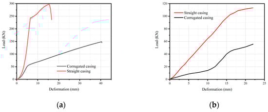 Figure 4a,b show the load-displacement curves for the uniaxial compression and uniaxial tension tests of the casing, respectively. From Figure 4a, it can be observed that, with the increase in deformation, the compressive load on both the corrugated casing and the straight casing increased. For the same deformation, the compressive load on the corrugated casing was significantly smaller than that on the straight casing. From Figure 4b, it can be observed that the corrugated casing bore a lower tensile load than the straight casing for the same deformation. Overall, in both the uniaxial compression and uniaxial tension tests, when the corrugated casing and the straight casing underwent the same axial deformation, the corrugated casing exhibited a significantly lower axial load than the straight casing. Additionally, both types of casing demonstrated a higher resistance to compression than to tension.