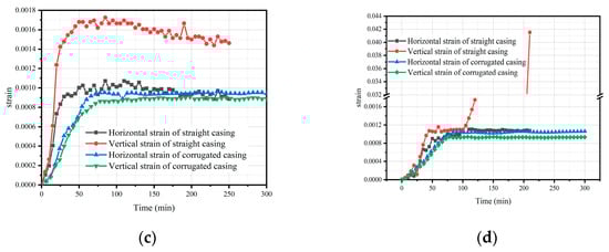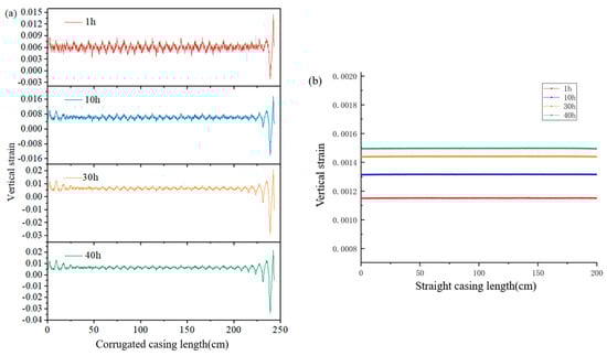 Figure 12 shows the variation in vertical strain of the wellbore casing during the heat-injection process. From Figure 12a, it can be seen that the vertical strain of the corrugated casing showed a periodic change, which was caused by the difference in the deformation of the crest and trough of the corrugated casing. With the increase of the heat-injection duration, the variation trend of the corrugated casing vertical strain did not change significantly. Figure 12b shows that, with the increase in the heat-injection duration, the vertical strain of the straight casing increased significantly, whereas the straight casing expanded thermally. The numerical simulation results were found to be in general agreement with the experimental results, confirming the corrugated structure of the corrugated casing, which can form a mutual occlusion structure with the solidified and hardened cement ring to prevent the corrugated casing from expanding and deforming along the axis direction. The corrugated casing and cement sheath cooperated with each other and showed good ability to resist thermal expansion-deformation.