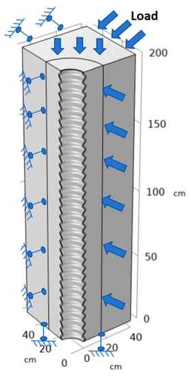 According to the in situ shale-exploitation technique, a numerical simulation analysis was conducted on a 200-cm wellbore section in a vertical well. The wellbore casing was modeled in two forms: corrugated and straight. Based on symmetry, one-quarter of the geometrical model was selected for the final simulation. The dimensions of each component of the model are shown in Figure 8.