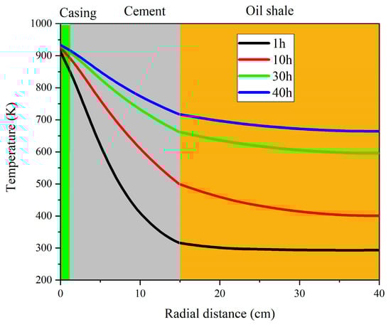 Radial temperature change of casing-cement sheath–oil shale formation at different times.