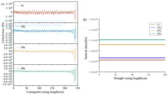 Figure 13 shows the variation of vertical stresses along the wellbore length distribution with time for the corrugated and straight casings. From Figure 12a, it can be seen that the vertical stress on the corrugated casing varied periodically with the change of wave crests and troughs, and the values were mostly within the range of −5 × 108–5 × 108 Pa. With the increase of the heat-injection time, the fluctuation range of the vertical stress did not show obvious changes. With the increase of the heat-injection time, the vertical stress of the straight casing showed a decreasing trend because the vertical stress of the straight casing was mainly influenced by the self-gravity stress and the vertical component of the thermal stress. Moreover, the directions of the self-gravity stress and the vertical component of the thermal stress were opposite to each other. With the increase in temperature, the self-gravity stress remained almost unchanged, while the vertical component force of thermal stress of the casing gradually increased. Meanwhile, the absolute value of the combined force of self-gravity stress and thermal stress gradually became smaller. Due to this reason, the absolute value of vertical stress of straight casing gradually became smaller. The vertical stress of the straight casing was a downward compressive stress, while the values were greater than 1 × 109 Pa. Moreover, the comparison showed that the vertical stress of the corrugated casing was significantly smaller than that of the straight casing, indicating that the corrugated casing had higher stability under the high-temperature condition.