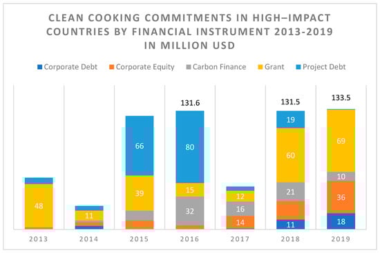 Carbon financing mechanisms have generated substantial funding from the clean cooking sector. Recent reports show, however, that aggregate global historical carbon finance flows to the clean cooking sector fall between US$60–150 million between 2013 and 2022 [44]. Hence, carbon financing still only provides a small portion of the overall commitments from different sources (see Figure 1 with the majority of the commitments being met by grants followed by debt and equity, largely for specific projects/countries, e.g., in Bangladesh and Kenya, and for LPG and domestic biogas.