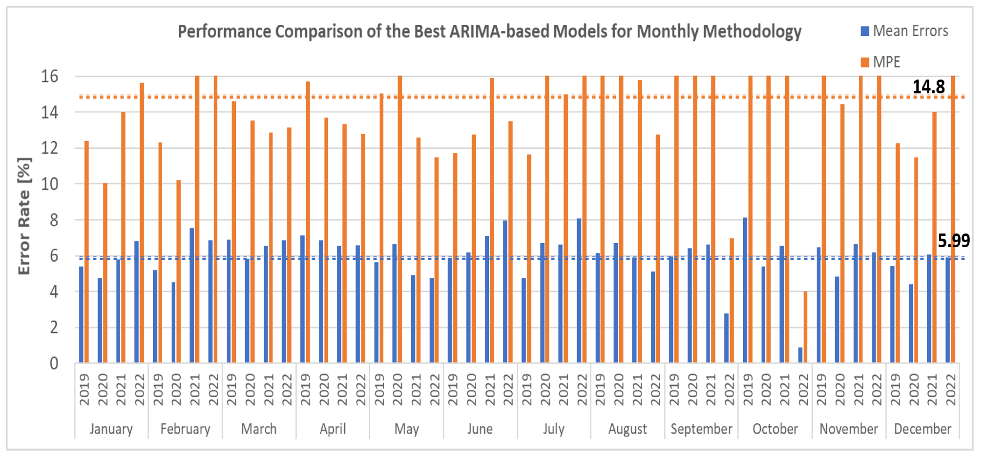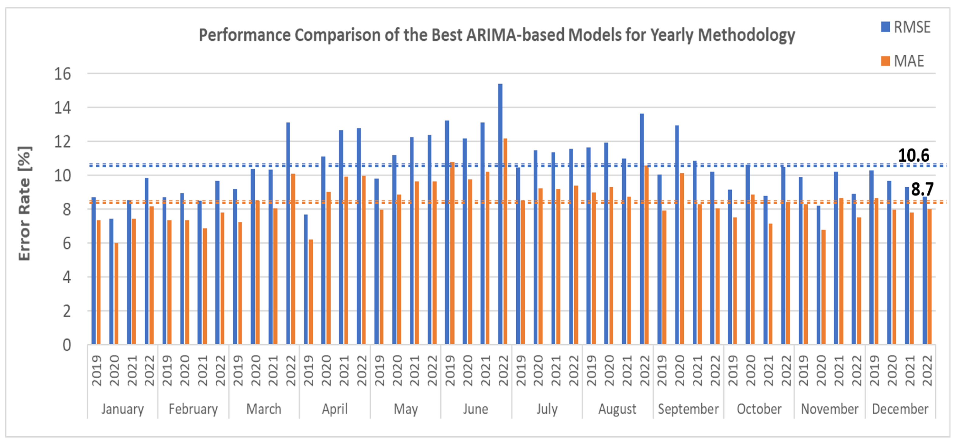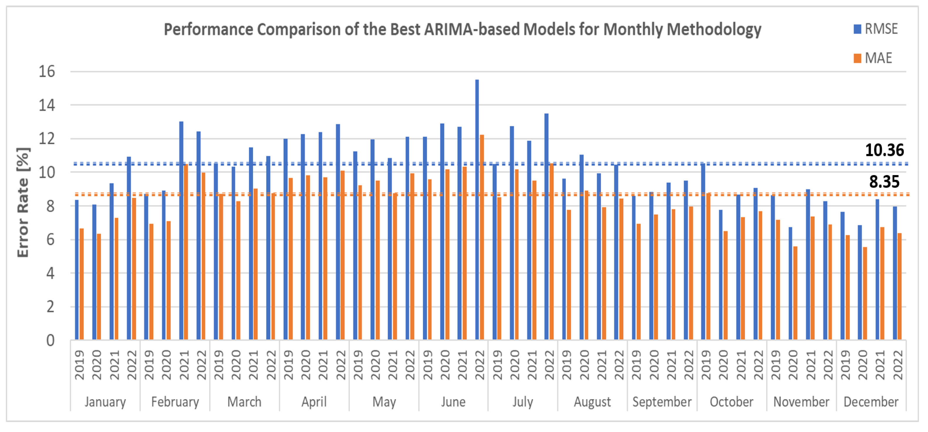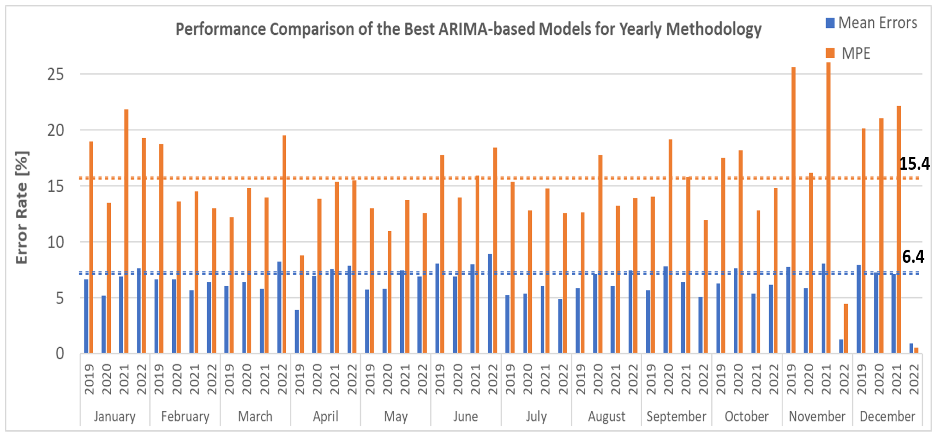 19], we went one step further and calculated for each methodology (i.e., yearly and monthly) and the 36 best models (12 months and each month the three best models of SARIMAX, SARIMA, and ARIMAX) the averages of all four performance metrics (RMSE, MAE, ME, and MPE) for four different years (2019 to 2022). Note that in calculating the overall averages, we attributed the same weight of 0.25 to all four considered performance metrics.