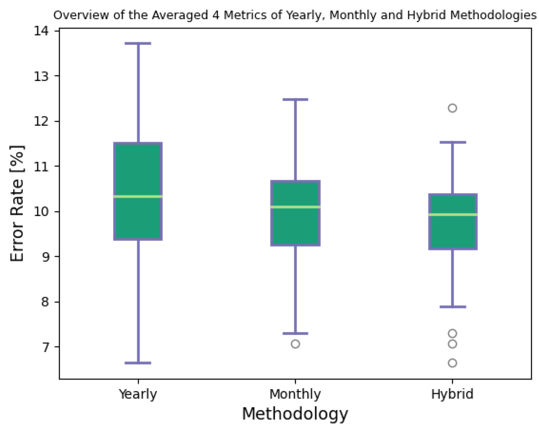 Figure 5 of the hybrid methodology. The hybrid methodology took the best part of the monthly based and yearly based methodologies and had median, minimum, and maximum error rates of 9.7%, 6.64% (reported as an outlier), and 12.3% (reported as an outlier), respectively. Note that the outliers (i.e., the circles in