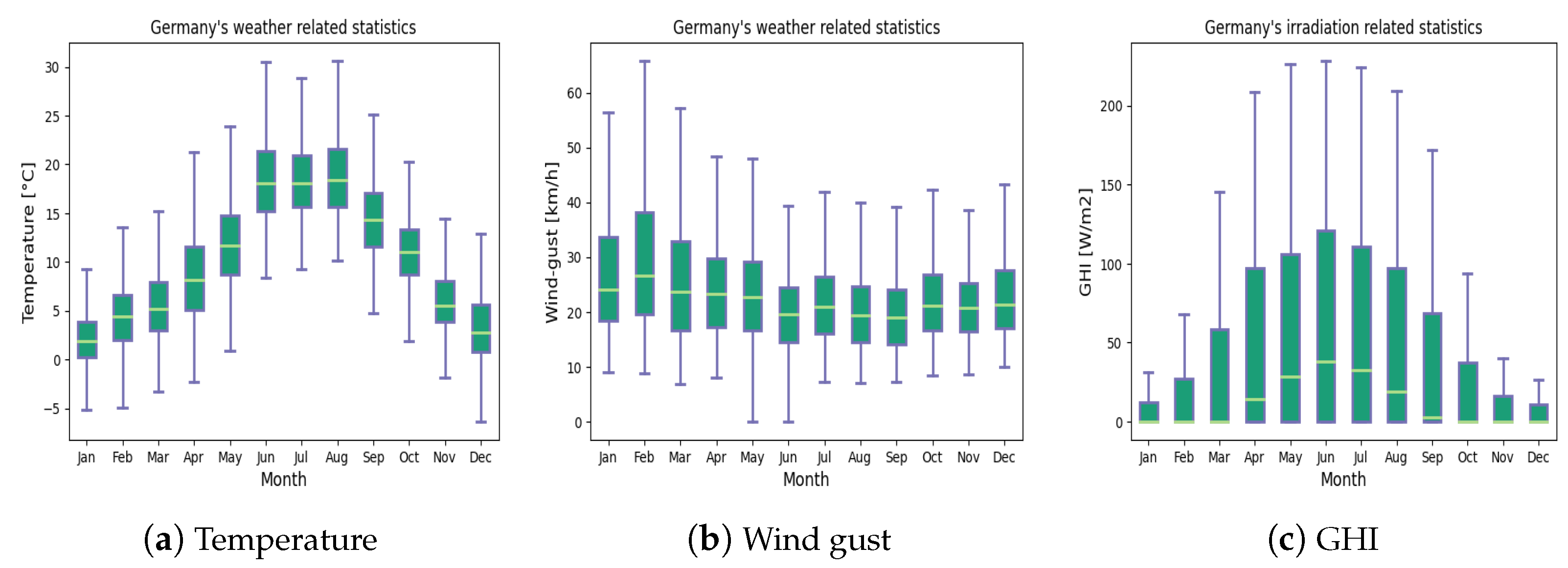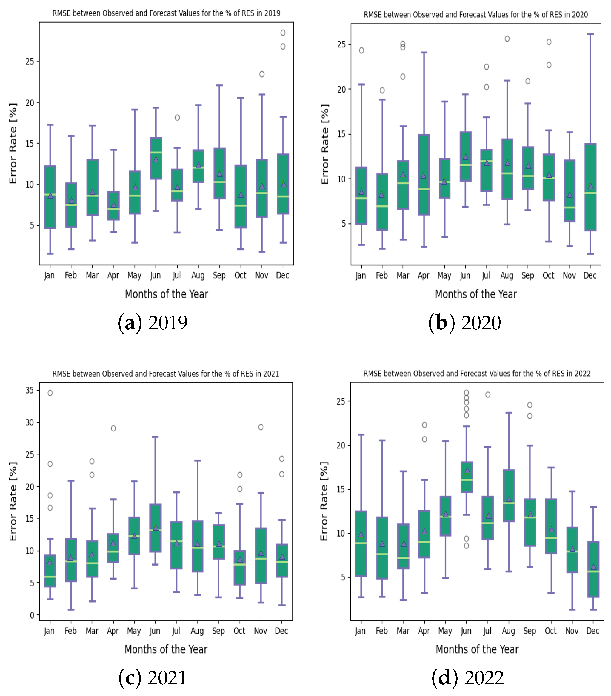 Figure 5 shows boxplots of the yearly based, the monthly based, and the hybrid methodologies. The three boxplots were created by considering four years (2019 to 2022) and 12 months (January to December), which resulted in 48 data points. Furthermore, each data point presents the average of the four performance metrics: ME, MPE, RMSE, and MAE. It can be seen in