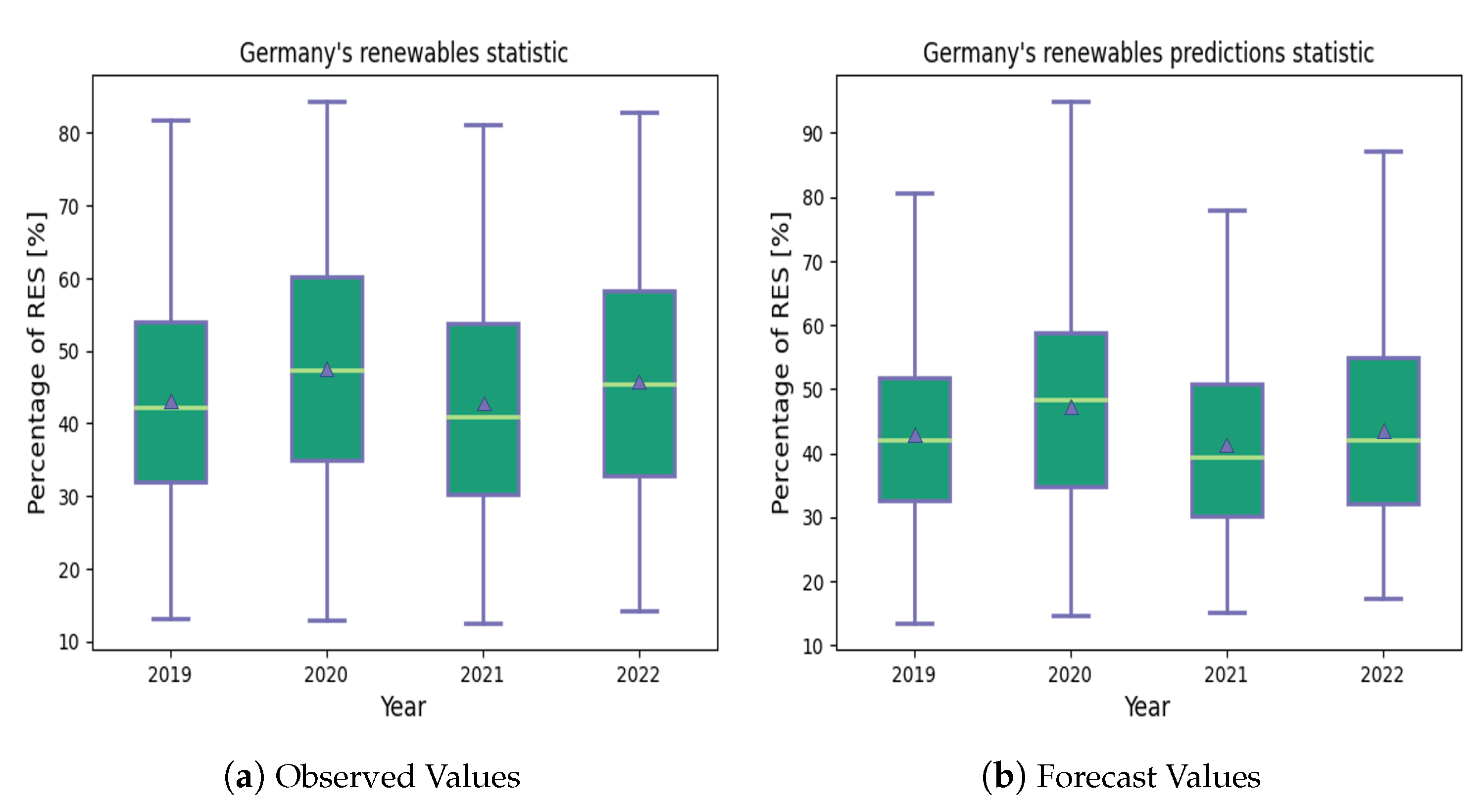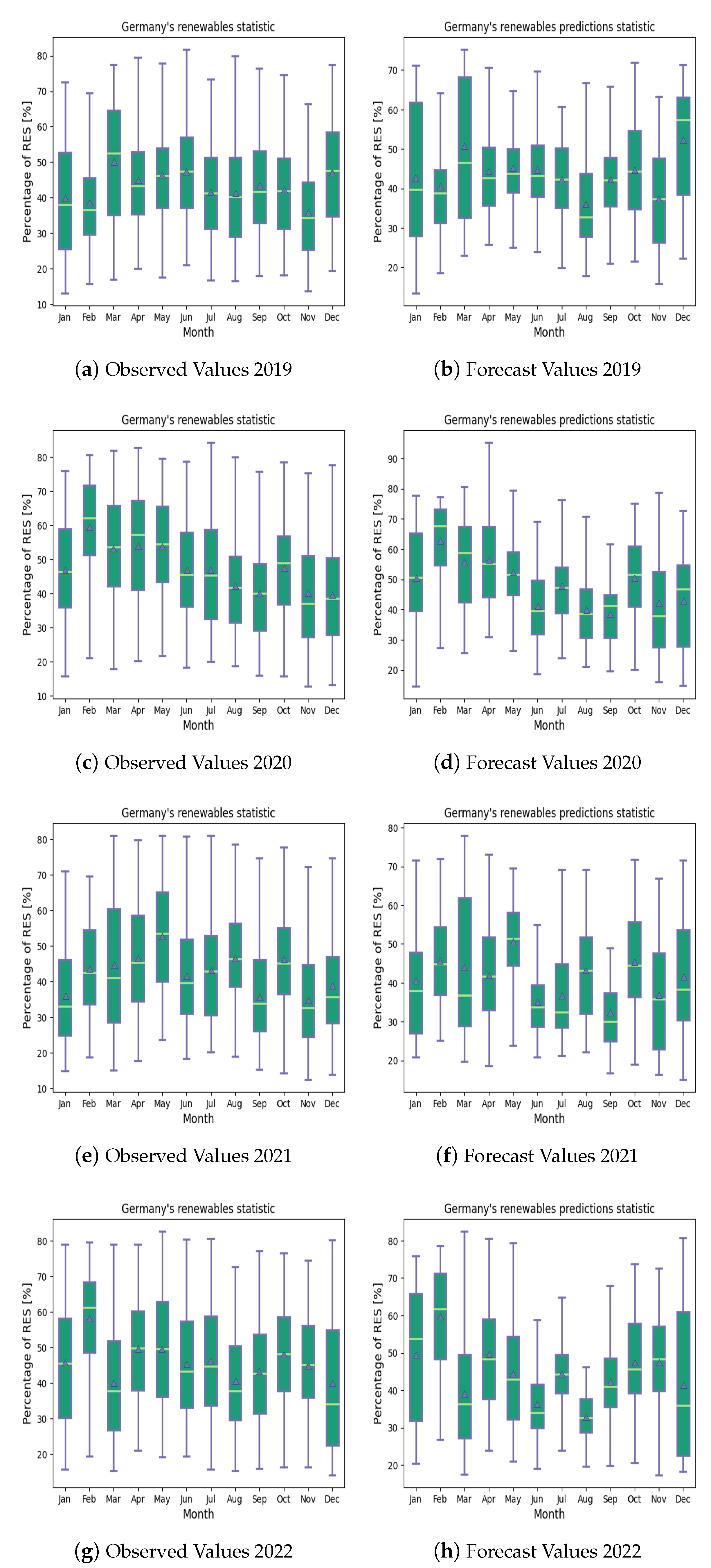 2]. To compare the accuracy of those two methodologies, unlike in our previous works, we assumed a consistent dataset spanning four years (1 January 2019 to 31 December 2022). Furthermore, we computed four different performance metrics (RMSE, MAE, ME, and MPE) for the best ARIMA-based model of each month and methodology. Using the equal weights of those four metrics, we then derived a new set of optimal models for the two considered methodologies, and we compared them to each other. We found that neither methodology was absolutely superior to the other: consequently, we proposed a hybrid of the two. Our hybrid methodology considered the best ARIMA-based model for each month of the year. By means of boxplots (i.e., minimum, maximum, mean, and median values), we showed that our proposed hybrid methodology improved accuracy (i.e., reduced error rates) compared to the yearly based and monthly based methodologies. Furthermore, we implemented those new best models in an open-source REN4KAST platform, and we provided the implementation details. Note that such a platform provides services (data retrieval, forecasting, evaluation), with respect to the percentage of renewables in Germany. We then carried out experimental analysis, by considering four years of data from Germany. We compared the observed (i.e., real data) to the forecast (i.e., models derived from our proposed hybrid methodology) values, and showed that the average annual RMSE for the four years was about 10.5%. To provide evidence of those improvements, we showed the distribution of the error rates for each month of the year. Our results showed that, in general, the months of May to September had higher error rates than the other months of the year, with the month of June suffering the highest error rates, of about 16%: we will reserve, for our future work, investigation of the reasons. Also, as a future work, we will investigate the impact of anomalies (i.e., outliers and missing values) in our dataset on the accuracy of the derived ARIMA-based forecasting models.
