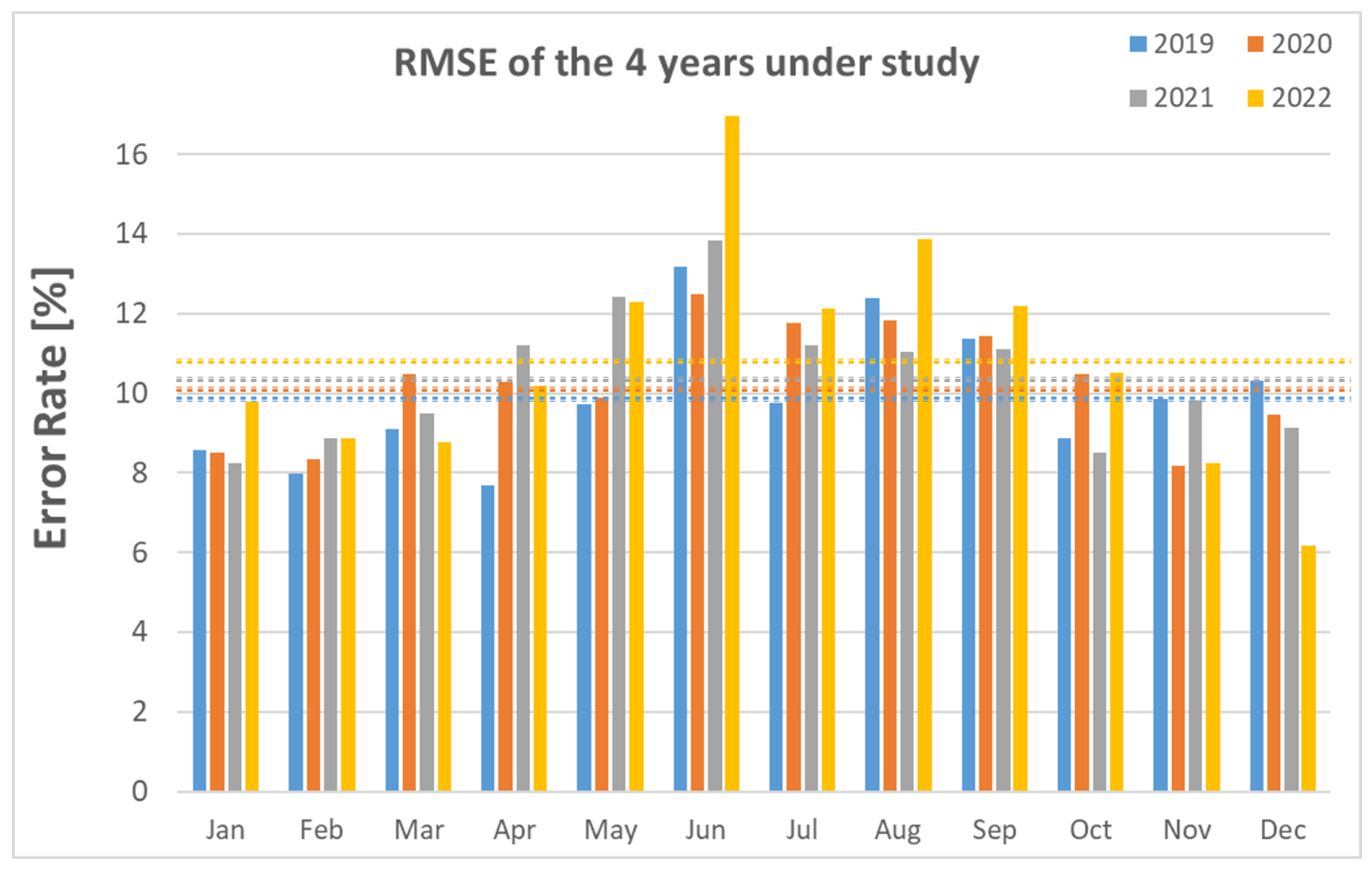 Figure 2 illustrate the four considered performance metrics—RMSE, MAE, ME, and MPE—of the yearly based methodology. Note that the horizontal dotted lines present the average value of the corresponding performance metric, by considering the results of four years. It can be seen from