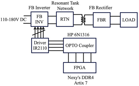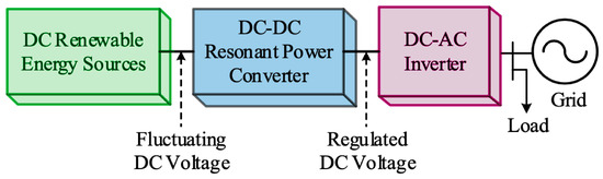 The United Nations Envision 2030 agenda has 17 goals for sustainable development which will lead to a bright future for sustainable energy. These goals are in line with Saudi Vision 2030. The proposed work goals support a reliable, cost-effective energy system, which is one of the United Nations’ SDG 7 goals. By using a zero-voltage switching method, this work promises to make a good energy-efficient system (SDG 12). To do this, the authors used techniques called “fixed-frequency phase-shift control” (SDG 9). The compact size and high power density of high-frequency operated converters have made them a popular choice for various applications, such as induction heating [1], energy storage [2], renewable energy sources (RES) [3,4], and hybrid electric vehicles (HEV) [5,6,7]. Since hard-switching is used in pulse-width modulated (PWM) converters, the switching losses are higher. Hence, the switching frequency is limited in PWM converters. The use of resonant converters (RCs) can significantly reduce switching losses through soft-switching techniques [8,9], enabling operation at high switching frequencies of 100 kHz and above [10]. As higher power-rated semiconductor switches such as IGBTs and MOSFETs become more widely available, resonant power converters (RPCs) are increasingly being adopted for grid integration of renewable energy sources, including photovoltaics [3]. A block-diagram representation of a resonant-type converter used in a grid-connected DC renewable energy source is depicted in Figure 1. The control of resonant power converters (RPCs) typically involves the use of a fixed frequency and variation, as noted in [11]. While variable frequency control can pose challenges in designing magnetic and effective filters, control with fixed frequency has emerged as a viable solution for overcoming such difficulties.