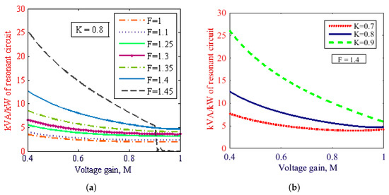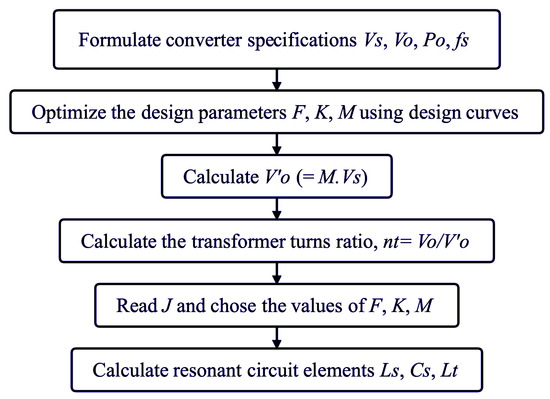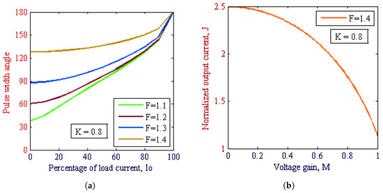 Figure 5 shows the variations in kVA/kW of the tank circuit with reference to conversion gain (M). The resonant tank’s kVA/kW rating exhibits the following trends: Firstly, as shown in Figure 5a, decreasing the frequency ratio (F) leads to a decrease in the kVA/kW of the resonant tank, with the effect becoming less drastic for . Secondly, Figure 5b shows that reducing the inductor ratio (K) also decreases the kVA/kW, but this decrement is relatively small for . Finally, Figure 5 demonstrates that the kVA/kW decreases as the voltage gain (M) increases, indicating that M is nearly equal to 1. Additionally, Figure 6 shows the variations in versus M for different F with fixed K set to 0.8 (Figure 6a) and 1 (Figure 6b). Analyzing Figure 6a, it can be observed that an increase in the frequency ratio (F) and inductor ratio (K) results in an increase in the peak resonant current (). The analysis in Figure 6a reveals that the minimum occurs at M = 0.8 with K = 0.8 for F = 1.4, in contrast to other F values. The curves of versus for different F with K set to 0.8 are depicted in Figure 7a, which indicate that the necessary pulse width angle for regulating the output voltage with respect to input and load voltage changes is negligible at F = 1.4 relative to other F values. Based on the findings mentioned above, the optimum design parameters are when K is 0.8, F is 1.4, and M is 0.8. Figure 7b presents the plots of the normalized output current (J) as a function of M for the selected values for K and F. The value of J is 1.75 for the chosen value of M. To calculate the circuit elements required for the selected optimum design with the lower value of , the following steps were carried out: First, the output voltage referred to as the HF transformer’s primary side, , was calculated as using (3). Second, the transformer turns ratio was based on the relation :(/) = 1:0.4. Using (22), = 126.21 µH, = 39.33 nF, and = 100.92 µH. Third, using Equations (12)–(14), the peak values are = 5.38 A, = 4.36 A, and = 367.7 V. Figure 8 shows the design flowchart for the converter.