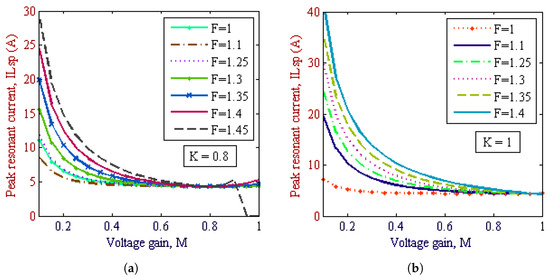 Peak () resonant current versus gain (M) for different values of F with inductor ratio (a) K set to 0.8, and (b) K set to 1.