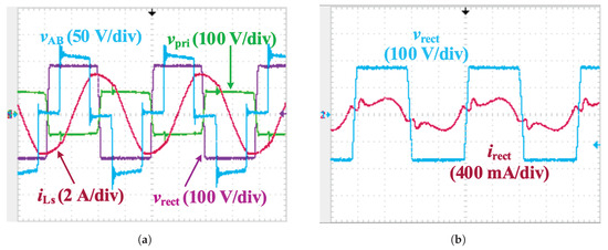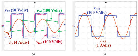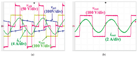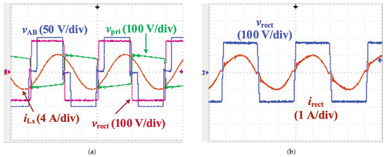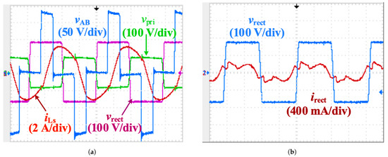 Practical results for the maximum voltage and full-load conditions (a) , , , ; (b) , . The time scale was set to 2.5 µs/div.