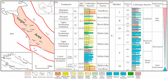 (a) Tectonic map of the Yingxi area in the Qaidam Basin (authors’ own elaboration); (b) Overview of the Cenozoic stratigraphy in the Yingxi area; (c) Stratigraphic column of E32 in the Yingxi area.