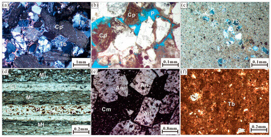 (a) Pack-wackestone, well S49-1, 3862.15 m, casting thin section, cross-polarized light, terrigenous debris are developed, mostly in the shape of superficial ooids, forming a mixed structure with carbonate particles; (b) Pack-wackestone, well S41-6-1, 3868.57 m, casting thin section, plane-polarized light, intergranular pores are developed, and the anhydrite cement has the characteristics of dissolution residual occurrence; (c) Mudstone, well S41-6-1, 3854.87 m, casting thin section, cross-polarized light, carbonate mixed with terrigenous clay and silty debris to form a micrite structure; (d) Laminated carbonate, well S41-6-1, 3865.80 m, rock thin section, plane-polarized light, the pores are developed in calcite laminae and saturated with oil; (e) Muddy gypsum, well S41-2, 4154.13 m, rock thin section, plane-polarized light, porphyritic anhydrite is developed and filled with clay minerals; (f) Limy claystone, well S41-2, 4148.90 m, rock thin section, plane-polarized light, mainly clay minerals with a small amount of calcite particles (Tb, terrigenous debris; Cp, carbonate particles; An, Anhydrite; P, porosity; Cl, carbonate laminated layer; Ml, mineral laminated layer; Cm, clay minerals; Cc, calcite particles; for well locations, see Figure 1).