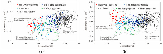 (a) Gamma ray and matrix density response characteristics of five types of lithofacies in the Yingxi area; (b) Gamma ray and bulk density response characteristics of five types of lithofacies in the Yingxi area.