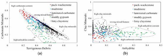The results calculated via Litho Scanner logs (Figure 4a,b) and XRD measurements (Table 1) can adequately capture the differences in mineral composition between different lithofacies. The carbonate mineral content of pack-wackestone was the highest. The mudstone had the second highest carbonate mineral content, and, in some cases, contained a small amount of anhydrite. The contents of terrigenous debris and carbonates in laminated carbonate were comparable with each other. The limy claystone presented the highest clay mineral content. The muddy gypsum contained a large amount of anhydrite.
