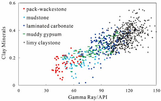 Among the five lithofacies developed in the study area, the clay mineral content of the limy claystone was the highest, associated with the finest grains and the highest natural gamma ray value. The clay mineral contents of the laminated carbonate, mudstone, and pack-wackestone were lower than that of the limy claystone. Moreover, the clay mineral content of laminated carbonate, mudstone, and pack-wackestone declined successively, while their grain sizes grew and natural gamma ray values reduced. In the presence of anhydrite, the clay mineral content and natural gamma ray value of muddy gypsum were low, just slightly higher than those of pack-wackestone. In view of lithofacies variation, natural gamma ray values and clay mineral content are positively correlated with each other (Figure 6).