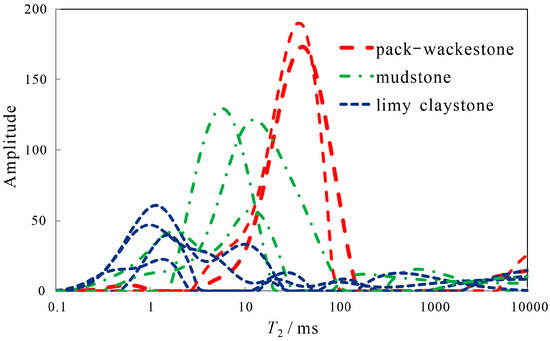 The grains gradually became finer, from pack-wackestone to mudstone and limy claystone, while the total porosity gradually decreased. The NMR data of cores revealed that, with coarser grains, the T2 spectrum energy grows, and the spectrum peak gradually shifts rightward, which indicates that the pore radius gradually becomes larger, the pore structure is improved, and the porosity rises (Figure 8).