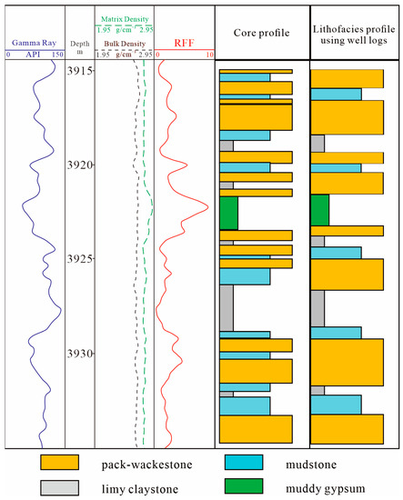 By combining the high-definition spectroscopy logs, the crossplots of RFF versus natural gamma ray and carbonate minerals versus terrigenous debris were prepared (Figure 9). The lithofacies boundaries in the two charts were determined by the distribution of each lithofacies data points, but data points of different lithofacies may overlap in the charts. For example, in the RFF–natural gamma ray crossplot, some overlap was found between the laminated carbonate and muddy gypsum; in the carbonate minerals–terrigenous debris crossplot, the limy claystone and laminated carbonate also had some overlap. The reason for this overlap is the similarity in log response characteristics and mineral components of some lithofacies. A portion of muddy gypsum with high clay content has similar natural gamma ray values to laminated carbonate, resulting in the overlap of these two lithofacies in the RFF–natural gamma ray crossplot. Furthermore, a portion of limy claystone with high carbonate content has similar mineral composition to laminated carbonate, resulting in the overlap of these two lithofacies in the carbonate minerals–terrigenous debris crossplot. Nonetheless, the five lithofacies can be distinguished from each other using the two crossplots simultaneously. For example, in the RFF–natural gamma ray crossplot, the laminated carbonate and muddy gypsum are seen with considerable overlap, but they are well separated from each other in the carbonate minerals–terrigenous debris crossplot; therefore, the laminated carbonate and muddy gypsum can be distinguished from each other.
