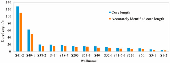 The lithofacies identification results of Well S43 are shown in Figure 10. The first track is the natural gamma ray log; the second, the well depth; the third, the matrix density and bulk density logs; the fourth, the RFF; the fifth, the core profile; and the sixth, the lithofacies profile identified using well logs. The cored section of Well S43 was 19.8 m long and included the pack-wackestone, mudstone, muddy gypsum rock, and limy claystone. The lithofacies identification method based on the RFF delivered satisfactory identification performance, except for thin layers (less than 0.2 m thick), due to the limited vertical resolutions of well logs. The interpretation accuracy of Well S43 was 87%. The methodology was applied to 55 wells in the study area, and the average accuracy of lithofacies interpretation in 14 cored wells reached 82.4% (Figure 11), which demonstrates good application performance.