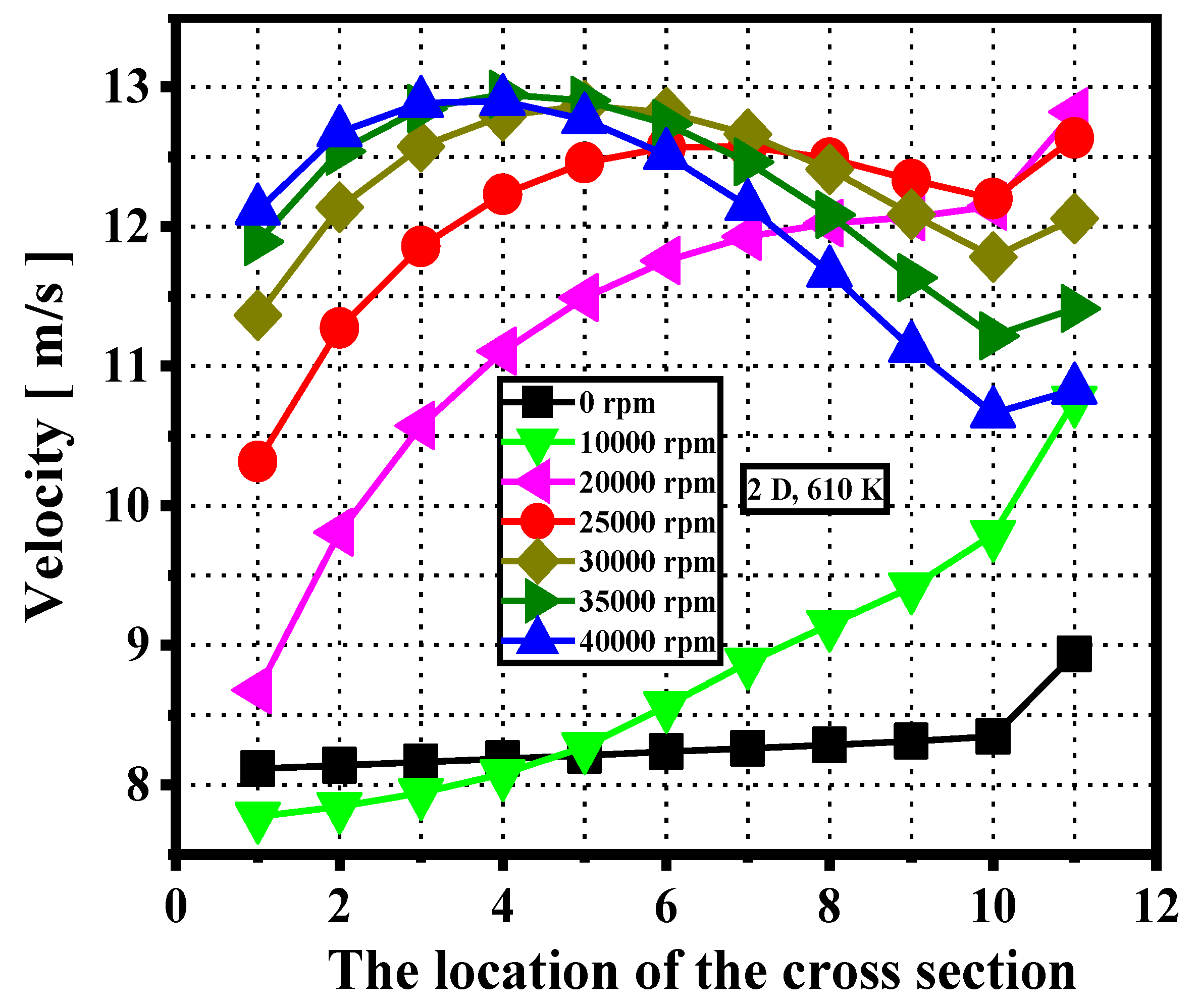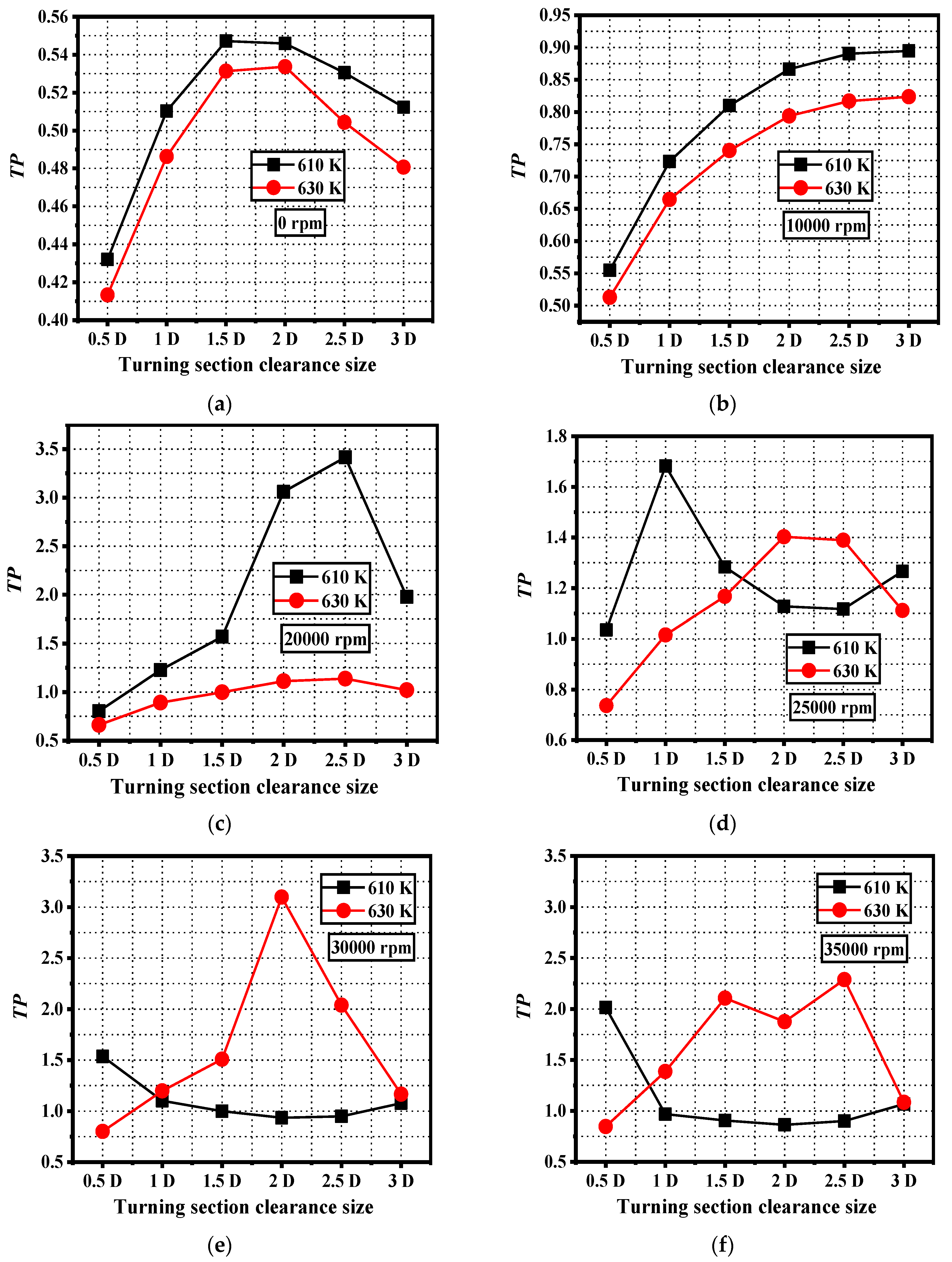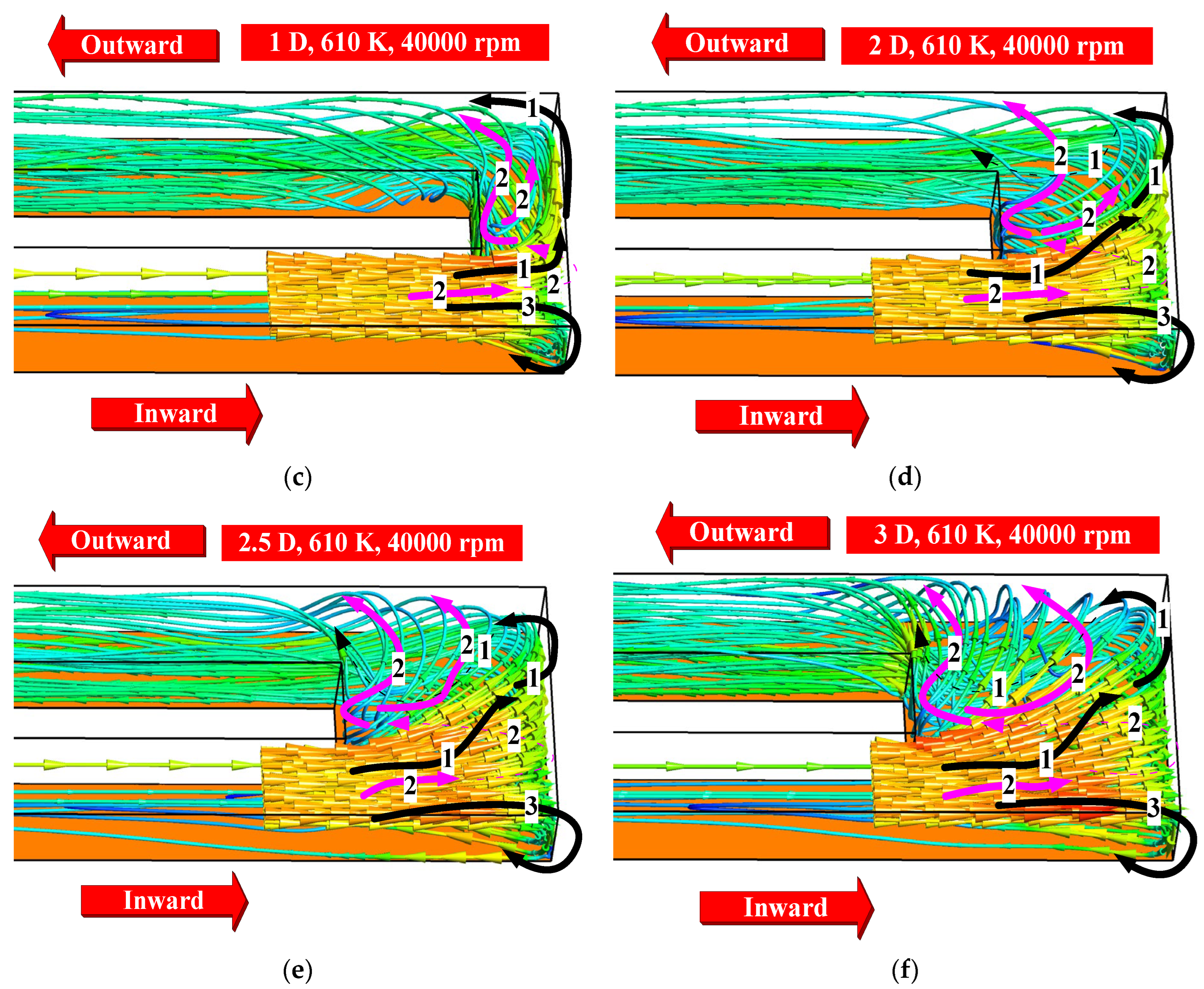 - The Nusselt number first increases and then decreases for all channels with different clearance sizes with an increasing rotational speed. When the clearance size is less than 1 D, the Nusselt number of the channel can be significantly improved by reducing the clearance size. The Nusselt number maximum is achieved in the range of rotational speeds from 10,000 rpm to 20,000 rpm for all clearance size channels.