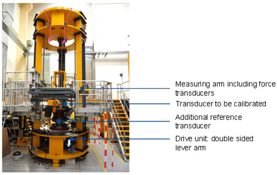 Since 2004, it has been possible to calibrate torque measurement up to 1.1 MN·m at the German NMI PTB in Braunschweig, Germany. To date, it remains the largest torque calibration machine in the world. The 1.1 MN·m torque standard machine (Figure 1) has a vertical measuring axis and is comprised of a drive unit at the bottom, an additional reference torque transducer underneath the transducer being calibrated, and a measuring arm including force transducers at the top. At the bottom, two servo-electric spindles apply the torque by driving a double-sided lever arm, which is arranged in a free-floating matter, in the same direction and in parallel. The measuring arm at the top is also a double-sided arm that splits the torque into two equal forces, which are measured. A multi-component strain-controlled hinge is present between the measuring arm and each force sensor, and strain gauges on these hinges measure the parasitic bending moments and transverse forces, which are reduced to a minimum amount. The machine serves as a national standard, with an expanded measurement uncertainty of 0.08% () in the measuring range between 100 kN·m and 1100 kN·m [25].