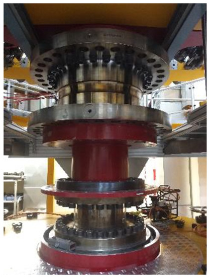 The 5 MN·m torque transducer is a specially designed and manufactured torque transducer for measuring torques up to 5 MN·m (nominal torque sensitivity of about 1.75 mV/V at 6 MN·m). The torque is measured in the form of strains, using strain gauges that are attached to the body that is being deformed. Here, the body is a hollow shaft with flanges for easier assembly (Figure 2). The transducer was developed for torque measurement under rotation in wind turbines and in a special system of test benches for wind turbine drive trains. In addition, it was equipped with a telemetry system for data transmission, which was necessary for this task [23].