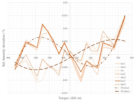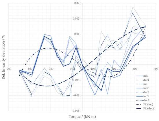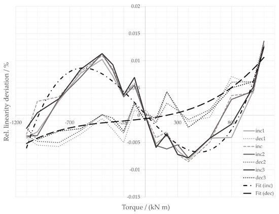 The linearity deviation of the measured load curves relative to the sensitivity at maximum torque load, as shown in Figure 3, Figure 4 and Figure 5, is a very characteristic representation for torque calibration. From this representation, the hysteresis, zero point deviation, repeatability, and reproducibility can be derived in addition to the linearity deviation. For the 5 MN·m torque transducer, the hysteresis is consistently in the range of 2 · for clockwise torque in all partial range calibrations. According to the literature, a scaling of the maximum torque would be expected. It is noteworthy that the course of the linearity deviation remains the same for each subrange and is not scaled, as expected from the literature.