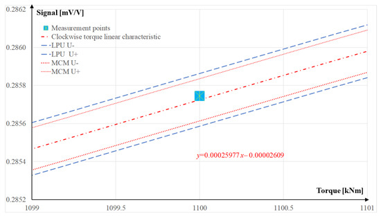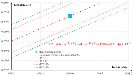 Figure 12 contains expanded relative uncertainties, which, for both matches and both methods below −300 kN·m and above 300 kN·m of the calibrated range up to −100 kN·m and above 100 kN·m, are from 0.03% to a maximum of 0.08%. Near torque values close to zero, the relative uncertainty of measuring a virtually close-to-zero signal loses its meaning. It also turned out that extrapolated expanded uncertainties when fitting using the cubic spline method increase significantly relative to the extrapolated expanded uncertainties for a linear fit.