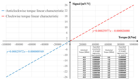 The classification criteria for anticlockwise torque are significantly below the limits for class 0.05, except for the linear regression deviation. Equations (6) and (7) show the linear regression equation for clockwise and anticlockwise torque, respectively, while Equation (8) is for the combination of clockwise and anticlockwise torque.