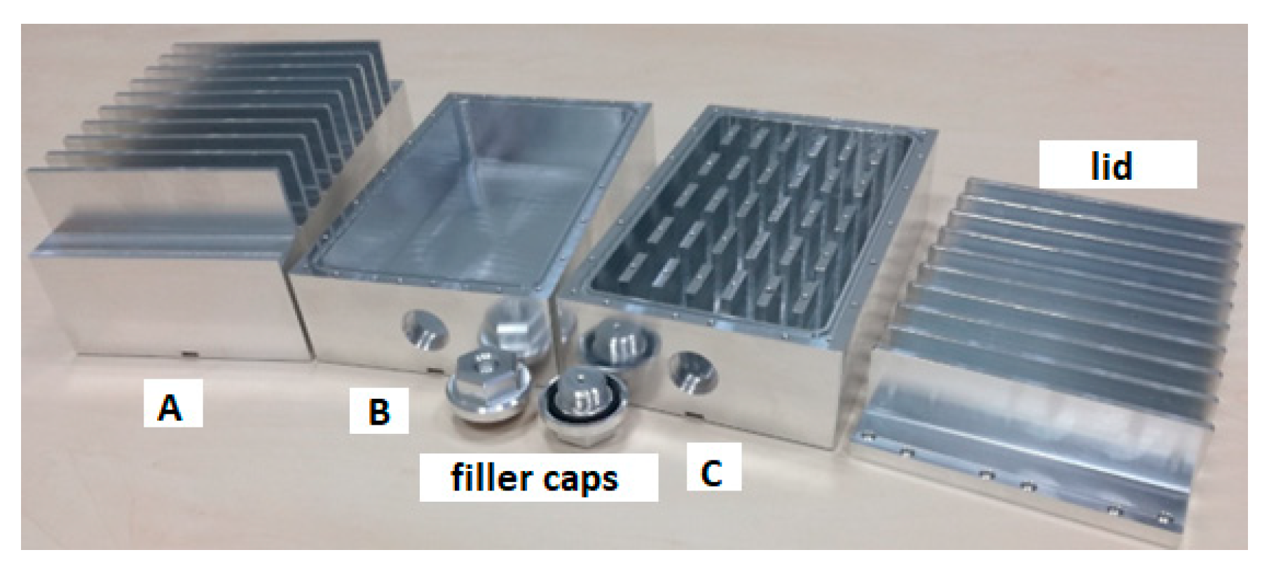 - Heat sink with PCM chamber without intra-chamber fins—configuration B;