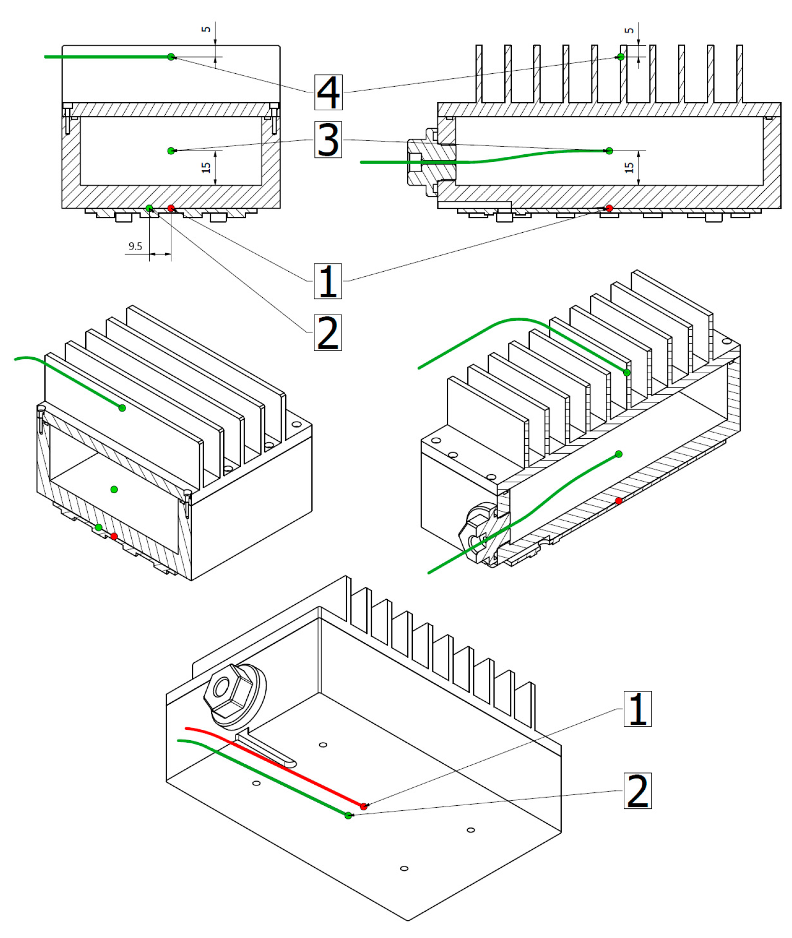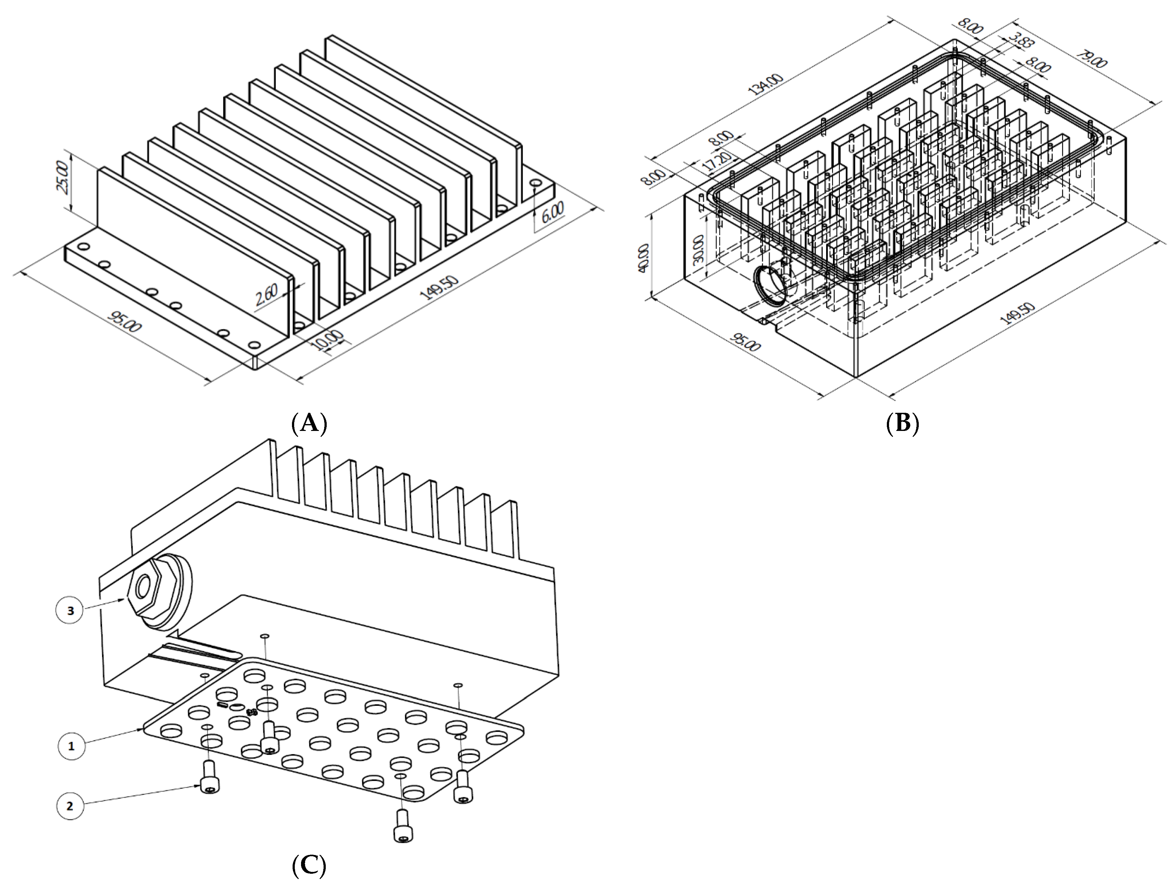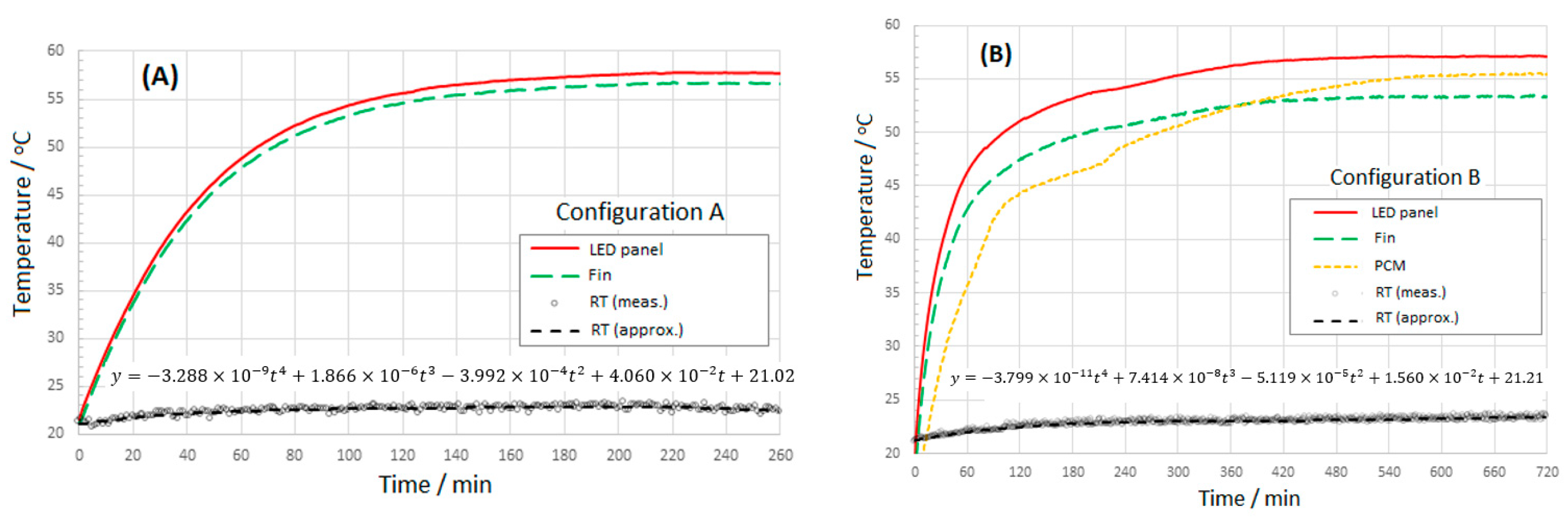 - All developed heat sink configurations showed a similar efficiency of cooling the LED panel after a sufficiently long time t > 10 h. Its temperature was stable at around 58 °C. However, configuration B (Figure 14D) compared with configurations A and C resulted in slower temperature rise to 480 min.