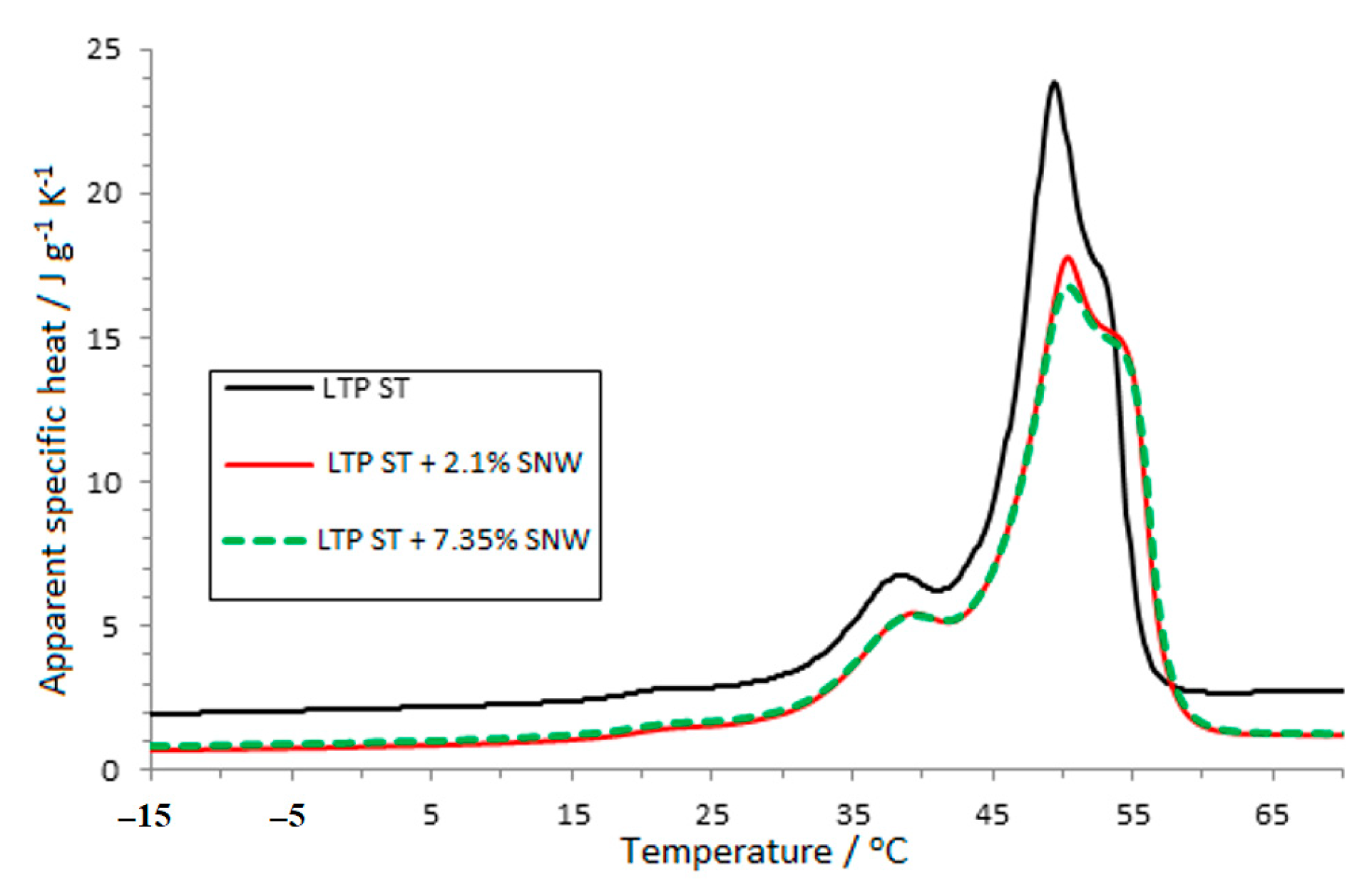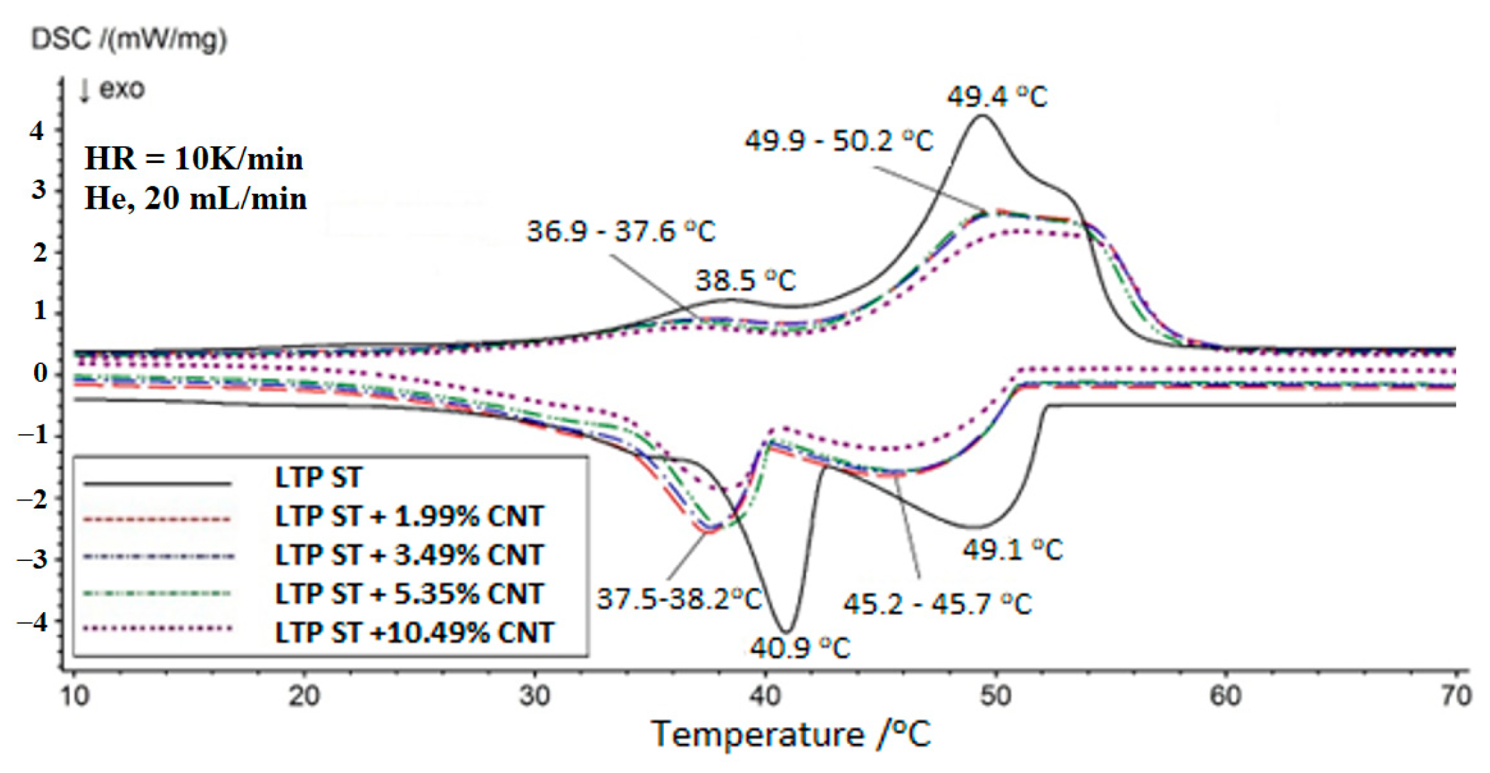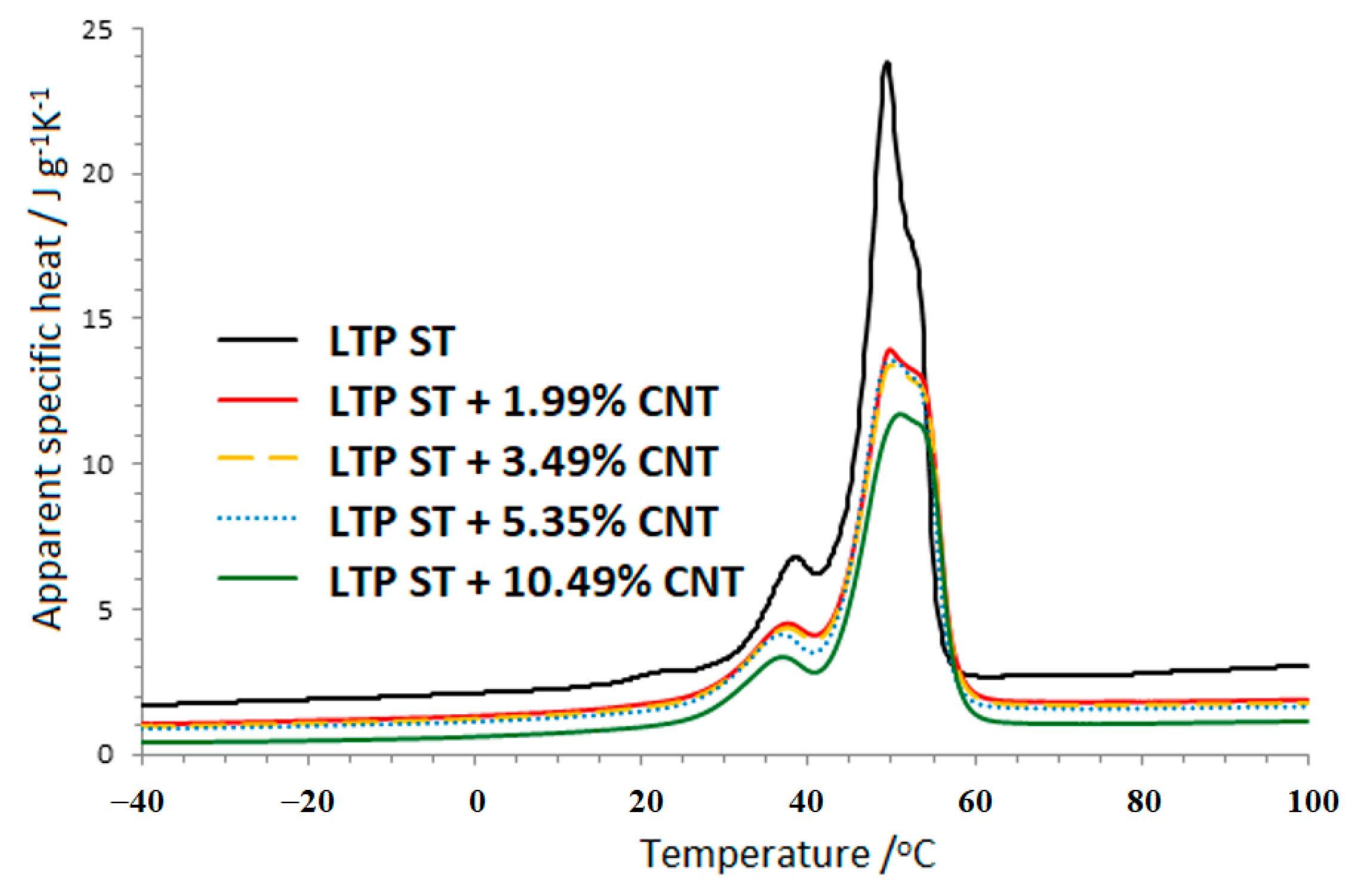 - Latent heat of fusion decreased by 25.1% for 10.49 wt% of MWCNTs and 15.7% for 7.35 wt% of SNWs compared with pure LTP ST paraffin (Table 3). The relative decrease in the latent heat of fusion in the case of MWCNTs can be expressed by the correlation formula Δh/h = −1.179·wt% − 13.128, R2 = 0.9644.